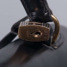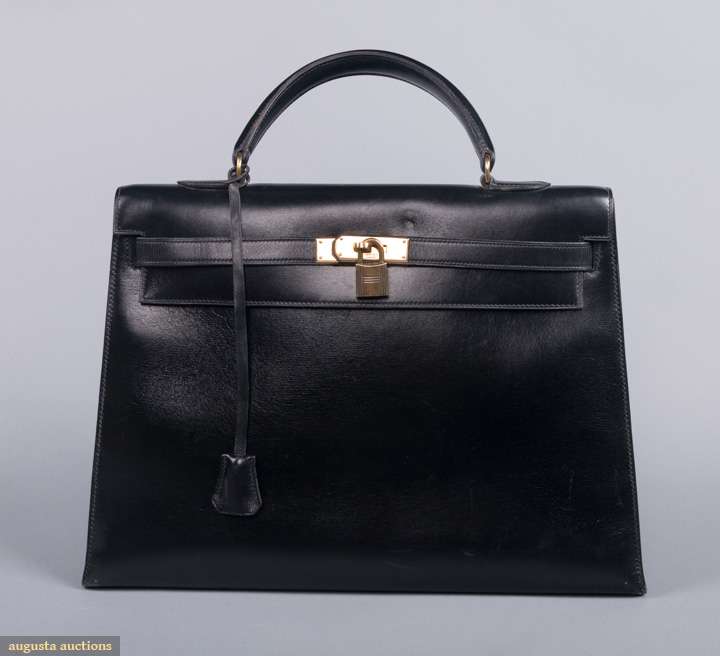 Black leather Hermes Kelly Bag, 35 cm, w/ original lock & key, no date code, (leather & brass buckle stamped"Hermes, Paris", "22"), WD 14", HT 10", DP 5", lock stamped #019, (expected wear to handle and edges, 5" scratch on back, leather key strap worn,1.5" scuff on base), very good
