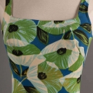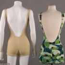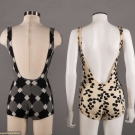 2 b & w: 1 w/ diamond designs, label "Brigance", B 36", H 36" & 1 w/ dots, label "Nina Ricci", B 34", W 25", H 34"; 1 beige knit, label "Gottex", B 34", W 25", H 34", 3 excellent; 1 green & white & black blossom print on blue, label "Robby Len", B 34", W 24", H 34", (stains on straps) very good. Museum at FIT.