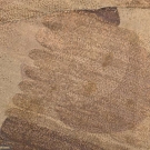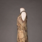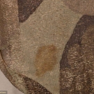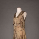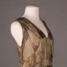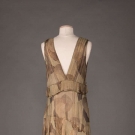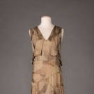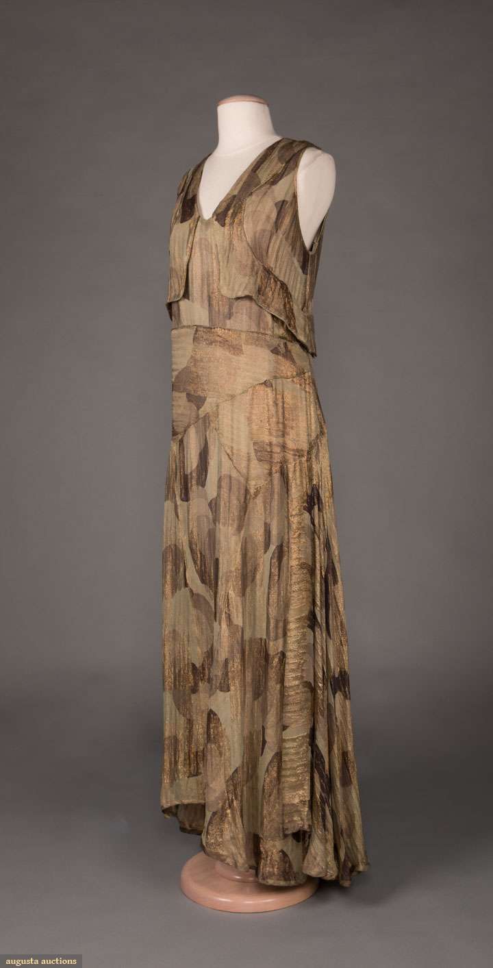 Lamé evening gown in gold, bronze & celadon Deco motif, V-neck, sleeveless w/ plunging back & self-vest & weighted W detail, c. 1929, W 32”, L 58”, (1” stain to CF hem, group of small stains in left front H, .025” stain in CB hem, wear to SH) go