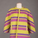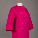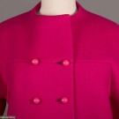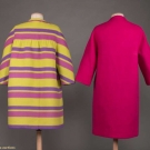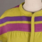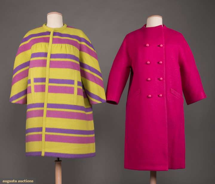 2 1960s wool day coats, ¾ length sleeve: 1 chartreuse felted wool, mauve & purple horizontal stripes w/ slit pockets at W, free opening, L 34”, & 1 double breasted fuchsia w/ angled slash pockets at princess seams, labeled "Robert Knox, New York”, L 38.5”, very good.