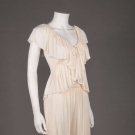 4-pc disco ensemble in white jersey c/o wide leg & high W pant, top w/ caped ruffle & peplum , bandeau top, long sleeve jacket w/ open front & yoked collar to pussy bow & wrap belt, label "Holly's Harp", B 34", Jkt L 30", W 26", Ins 31", (stain to left B & small hole to left front underarm on jacket, stain to right knee & above right hem on pants) good.