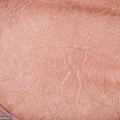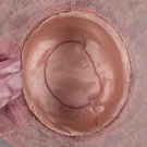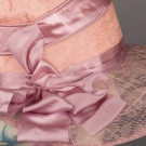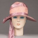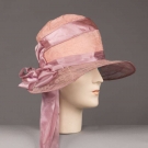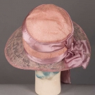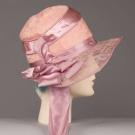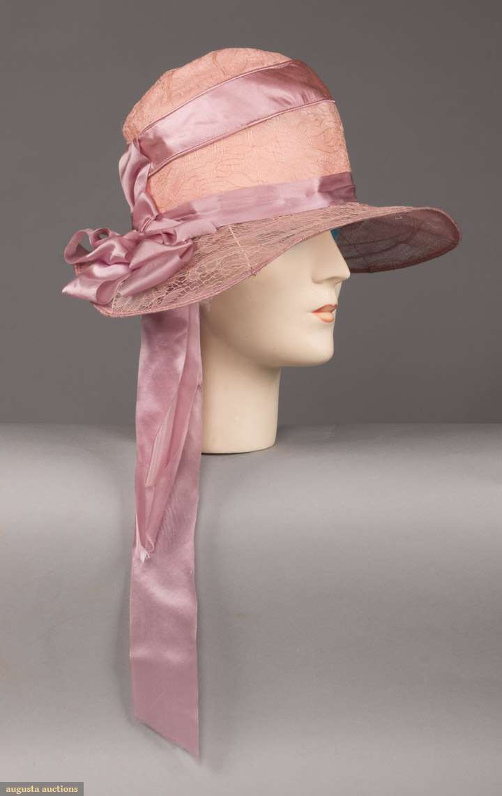 Early 1920s afternoon hat in peach pink silk w/ lavender silk ribbon & lace covered wire brim, bow accent behind right ear, (wire exposed at front right) excellent.