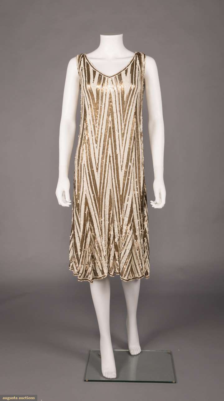 White & gold sequin on net 1920s evening dress in chevron motif w/ flared hem, B 34", W 25", H 34", L 44", (rows of missing sequins especially at B up to 10" long) good.