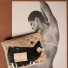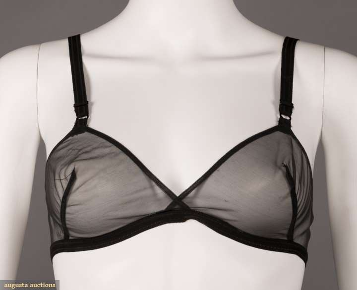 No-bra bra by Rudi Gernreich in sheer black nylon net w/ original packaging & magazine advert, label "Exquisite Form", 34A, very good.