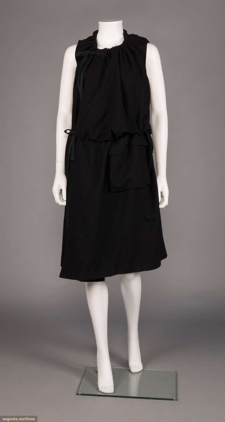 Black boiled wool sleeveless wrap dress w/ expandable ties for neck & W, patch pocket at left front H, label "Plantation" by Issey Miyake, free size, L 44", (tiny stain to right side hem) excellent.