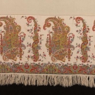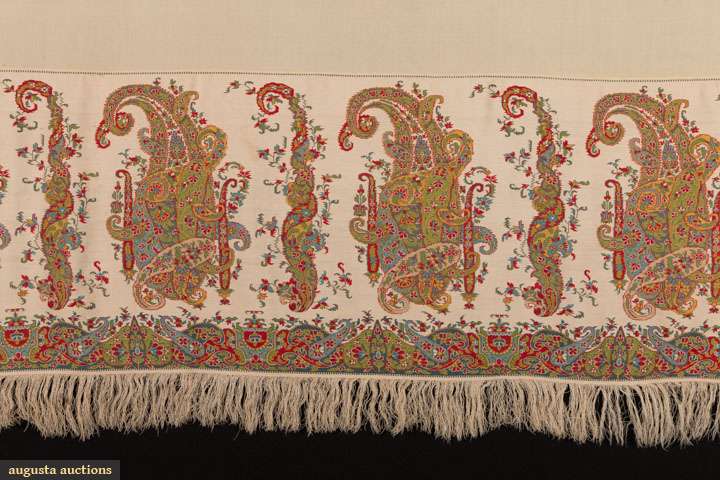 Woven cashmere shawl w/ multi-colored paisley border & fringe, WD 53.5", L 100", Fringe 2.5", (many small/tiny holes especially at center, period repairs up to 1") good.