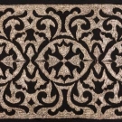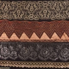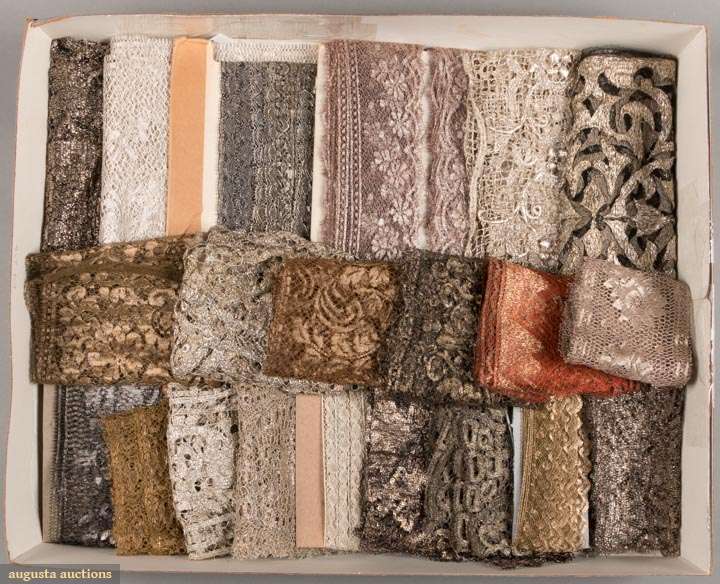 20 lengths of deadstock lame lace yardage, flounces & inserts ranging from WD 0.5"- 10.5", L 11"- 32 yrds: 1 pale silver wide lace WD 9", L 4+ yrds; 1 wide black net w/ silver, WD 11", L 33"; 1 orange & gold w/ triangle motif, WD 4", L 42", good - excellent.