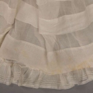 3 pc cotton batiste: 1 monobossom bodice w/ Van Dyke lace, lace band inserts, CB 4 button closure, puff sleeves w/ lace inserts gathered to elbow falling to engageante sleeve, B 46", W 27", L 18", (3" opening at L sleeve); 1 skirt w/ 3 tucks & lace insert; 1 ruffled & trained petticoat; 2 undyed cotton: 1 underskirt w/ lightly embroidered Van Dyke hem, L 44/51"; 1 corset cover w/ drawstring W, snap closure & string SH straps, (all w/ some staining) all very good-good.