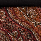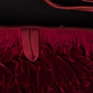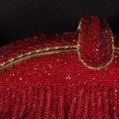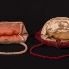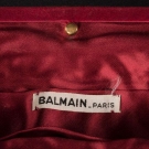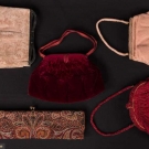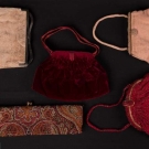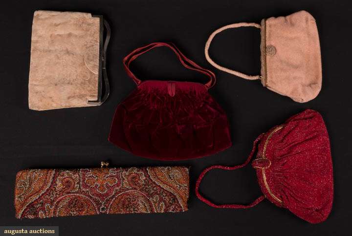 1 red velvet w/ red satin trim, handle & interior, label "Balmain", c. 1950s, L 10", H 7", (very light wear to velvet, few snags in satin) very good; 3 beaded bags, ranging from L 14", H 4" to L 10", H 7": 1 red label "Handmade in France", very good & 1 pink w/ beaded frame, handle & rosette clasp, good & 1 multi-colored paisley pattern w/ bud clasp & scarlet satin interior, label "Handmade in Belgium", (some wear to corners, minor bead loss) fair; 1 fawn velvet, WD 9", HT 7" good.