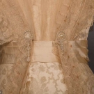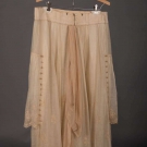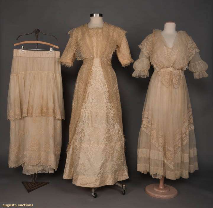 1 cream patterned silk w/ open front embroidered net overdress & satin cummerbund to stylized bow at CB, 2 pearl & crystal beaded passementeries to CF W, (silk ribbon at back shattering & detaching at side, pearl missing R side, stains) fair; 1 cotton lawn tiered skirt w/ floral whitework embroidery, W 34", L 42", (a few small .25" stains in overskirt, lots of light stains in underskirt) good; t/w cream tea gown w/ lace & embroidery.