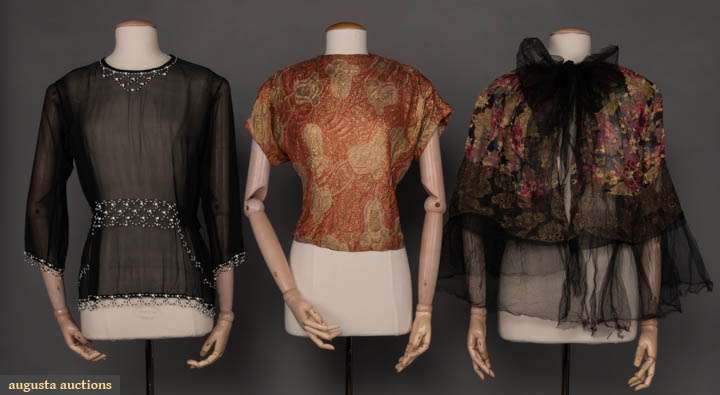 1 black chiffon blouse w/ white & black beading at neck, W, cuffs & hem, round collar, self tie belt, B 40", L 24", L including beads 25", (tiny hole at right B) very good-excellent; 1 gold lame & tangerine silk w/ tulip motif, short sleeves, gathered at SHs, B 41", W 33", L 19", (some tarnish) very good; 1 floral chiffon capelet w/ brocaded gold lame, trimmed w/ lame lace & tulle ruffles, gathered at collar, black tulle tie at CF, L 25", (tears in net) fair.