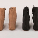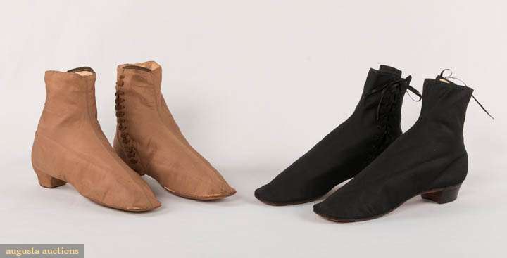 1 pair black silk & wool blend lined in linen w/side lacing, (lacings not original) pristine; 1 pair brown silk faille w/ silk covered heels, "6078" & "Miss Miller" inked inside R shoe, (0.25" hole & 1" tear to back of right boot, silk pulling away from sole for 2.25" on left boot at inside edge, wear to heels & toes) very good.