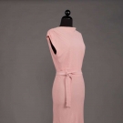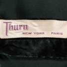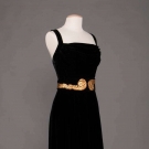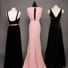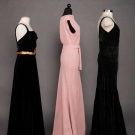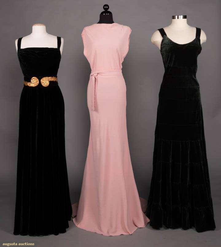 1 pink sleeveless pooling floor length textured crepe w/ chapel train, slight cowl neckline, pleated & gathered SHs, large keyhole back, self belt, B 37.5",W 28", L 64-79", (slight soil at hem) excellent; 1 black silk velvet w/ square neckline & draped B, self belt w/ padded & stiched gold kid applique, B 36.5", W 29.5", L 60", (oxidation on belt closures) excellent; 1 dark green silk velvet w/ banded bodice & ruffled skirt, B 35.5",W 33", L 61" labeled "Thurn", (some general wear to velvet) very good.