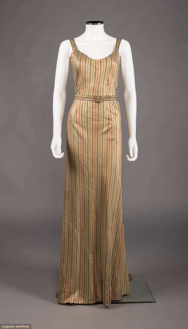 Gold bias cut tissue w/ red, blue & green stripe interspersed w/ black, scoop neck, backless fitted bodice, flared skirt w/ tiered ruffle sweep train at CB, self belt, evening wrap w/ self tie, drop sleeve, tiered ruffle detail & gathered W line, B 34", W 29", L 62-65" (large areas of tarnish, tiny pulls, 2 conserved tears at left armscye on jacket, minor wear to belt buckle) gown very good, jacket good.