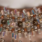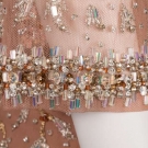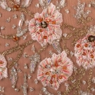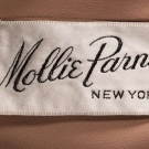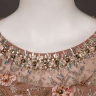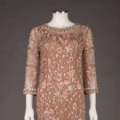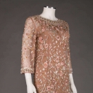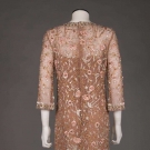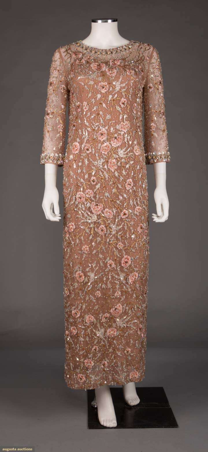 Long sleeve evening sheath in taupe net w/ pink embroidered flowers, gold vines & silver beads & spangles, over strapless silk crepe, labeled “Mollie Parnis, New York”, B 36”, H 36”, L 54”, (bead loss, pulls in embroidery on left sleeve) very go