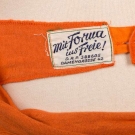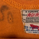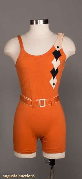 1 rare DRP lady's pumpkin swimsuit w/ B&W felt diamond Deco appliques, self belt, c. 1950, labeled "Mit Forma ius Freie!, DRP", B 31" , W 28", L 27.5", (spot stain L side) very good; t/w boy's striped wool 1 pc. Suit c. 1900-1920s, CH 30.5", L 28", (moth holes, brown stains); 1 wool small boy's suit, genuine "WIL WITE of Olympia Washington" c. 1930s, sold at Boy's Shop, Desmond's, LA, CH 17", L 18", (single moth hole L B, hole & initials by label)