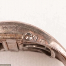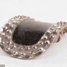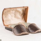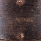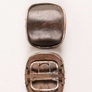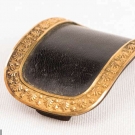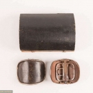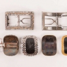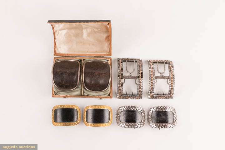 1 pair man's shoe buckles of leather & silver w/ functional closure, in papercover wooden box, halmarks of Lion & profile of George III, date mark "S", c. 1794, 3" x 2", (leather scuffed, tarnish, 1 side of box lid missing, box worn & scuffed) fair; 1 pair paste & pinchbeck w/ tabs, mid 18th C, 4" x 2", (tarnish, stones missing) fair 1 pair clip-on gilt w/ leather center, England, late 18th C, 2.5" x 1.5", (minor scuffing & tarnish, back rusty) very good; 1 pair cut steel w/ leather center, spring back mechanism, 2.5" x 1.75", (leather scuffed, back rusty, tarnish) good.