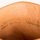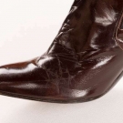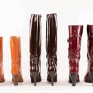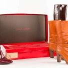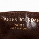 All w/ original boxes: 1 pair oxblood pull on style w/ wrapped self-strap & buckle, label "Charles Jourdan, Paris, Made in France", L 10", Wd 3.5", Ht 16.5", size 9, (soles of heels gone, worn soles, minor scuffing) good; 1 pair camel w/ stacked heel & decorative chanel tie at CF, "Jourdan Design, Made in Italy", L 10", Wd 3.5", Ht 13.5", size 8.5, (scuffing, dark marks inside heel on right boot, fraying to ties, worn lining) good; 1 patent dark brown leather fitted knee height heeled boot w/ zip closure, label "Charles Jourdan, Paris, Made in France", L 10", Wd 3", Ht 19.5", size 9B, (creased leather, small tear at base of each heel, soles worn) very good. From the Collection of Karen Augusta.