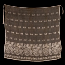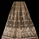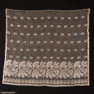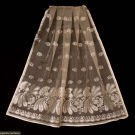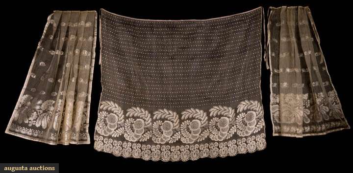 All woven silk gauze w/ Dresden embroidery inspired floral motifs: 1 in abstract cornucopia motif w/ dots to top half, scalloped border w/ applied edging & original silk drawstring, 41" x 37.5", (tiny holes) very good; 1 in orchid & floral pattern in horror vacui style w/ silk drawstring, 33" x 34", (tiny- small holes, discoloration) good; 1 in dense paired floral border pattern w/o drawstring, 39.5" x 35.5", (tiny- 0.5" holes throughout, missing drawstring) good.