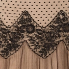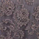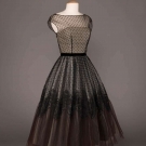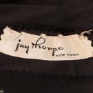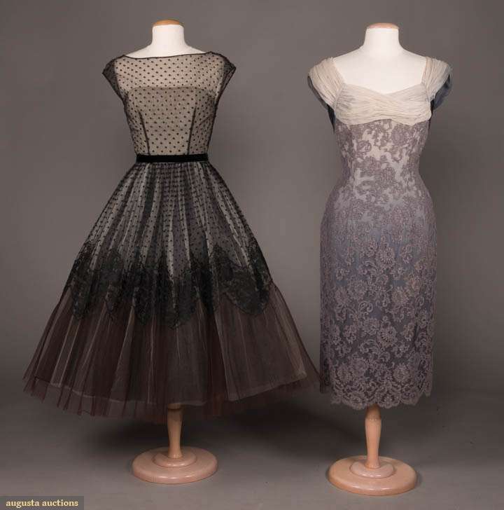 1 black tulle point d'esprit fitted, sleeveless bateau bodice over black & white synthetic strapless, boned sheath, full layer multi-colored tulle skirt in black, brown & white embellished w/ applied black lace zigzag, black silk velvet ribbon tie for W, label "Jay Thorpe, New York", B 33", W 26", L 47", (tiny tear in top layer of tulle at B & at left of top zipper) very good; 1 silk evening sheath in ombre dove to slate grey w/ grey Guipure lace over dress & cream to slate grey ombre silk chiffon wrapped & pleated B, SH & neckline extending to CB cascade, B 38", W 30.5", L 47", (label cut out, staining to neckline, knees & back left H, fraying at underarms esp. in underdress) good. Provenance: Sara Conklin Brown, NYC & Vermont, (1917-1992)