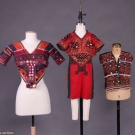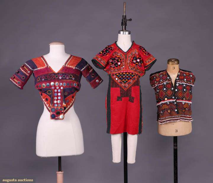 1 Sindhi embroidery handmade cotton choli of multicolored pieced embroidered bands in shades of indigo, orange & red w/ elaborate mirrored inserts & cut & appliqued undyed cotton borders, mid 20th C, open back, L 25.5", (mirrors damaged, lightdiscolorations, unfinished CB edges) good; 1 Banjara embroidered handmade choli of crimson cotton w/ forest green & curry colored cotton edgings & inserts & mirrored inserts, 19th C, open back, L 18.5", (mirrors damaged, back ties untwisting) very good; 1 child's intricately hand embroidered waistcoat w/ rows of multicolored beads, lined in red floral printed silk, Kohistan, early 20th C, CH 24.5", L 14", (plastic buttons added, bead loss top back stripe) very good- excellent.