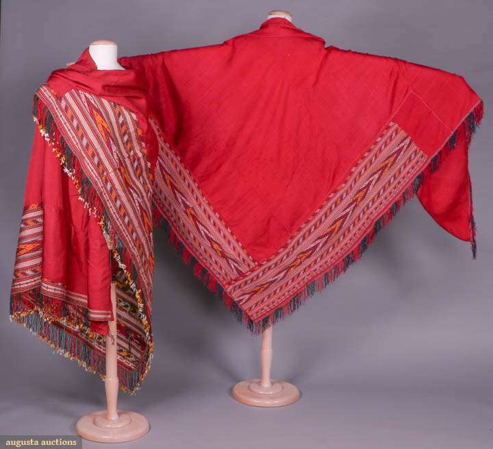 Both triangular w/ asymmetrically pieced, woven geometric large scale banned border in shades of yellow, white & black extending from vertex & woven fringed borders, black woven corded trim at top edge: 1 maroon w/ applied woven fringe border inshades of red, green, saffron & white w/ small hand tied tassels, unlined, 52.5" x 92" w/ 3" fringe, (large light stains at CB) good; 1 crimson w/ red, midnight navy & white woven & tasseled fringe, vertex backed in printed Russian cotton, 52.5" x 122.5" w/ 2" fringe, (wear & pilling to fabric, smattering of black spot stains right edge, pulls to fabric) good.