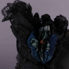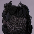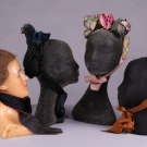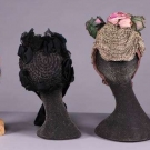 1 black plaited straw w/ Chantilly lace frou-frou & blue silk flower, black silk satin bow to black satin ties, circumference 18.75", (flower bit crushed, ribbon fraying 1 end) very good; 1 taupe straw w/ pink & green cloth rose petal panache, 7.5" x 8.5", (ribbons fraying, flowers loose & crushed, misshapen) fair; 1 black horsehair bonnet w/ lace ruffle, painted cloth rose, circumference 19", (metallic & lace trim frayed & messy, flower crushed, straw trim broken, ribbons fraying) fair; 1 cinnamon velvet & silk ribbon w/ black jet faceted beads, circumference 20", (loose beads, start of bead disease, discoloration to velvet, lining starting to detach, wear to velvet on brim) good.