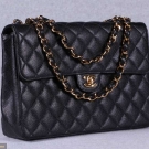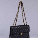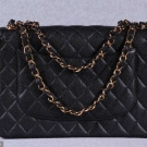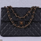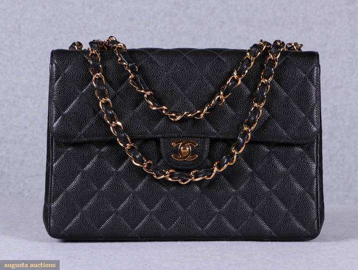 Unused jumbo handbag w/ classic single flap, black calfskin quilted leather, interwoven SH strap in gold tone chain & leather can be worn doubled up or as single strap, gold tone Chanel logo "CC" twist lock closure, single back exterior curved ppatch pocket, 1 interior patch & 1 zip pocket w/ "CC" logo pull, comes w/ Chanel protective slip cover, interior hologram authentication sticker w/ serial #6136656, label "Chanel, Paris, Made in France", 12" x 8.5" x 3", very good-excellent.