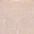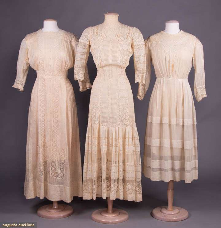 1 w/ drawn thread embroidery, French knots & floral motifs to CF & cuffs, fine tucks to CB & sleeves, thread buttons, knife pleated at W band w/ 3 horizontally tucked skirt ruffles, c. 1912, B 38", W 26", L 45", (2.75" stain CF, 0.5" stain right B, three 0.25" spot stains left front SH, 1 detached & included snap, 1 missing faux button, pulls & 0.25" spot stain seat) fair; 1 princess line entirely of lace insertions & cotton lawn w/ 2 crocheted appliqués at either side of B, c. 1911, B 42", W 24", L 56" (neck wire poking out, 2 light spot stains back left knee, 0.75" hole right cuff) good; 1 silk w/ lace insertions & faceted glass buttons to CF, B 47", W 32.5", L 53.5", (light underarm stains, 1.5" tear at bottom of CB hook & eye band) good.