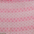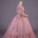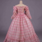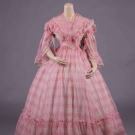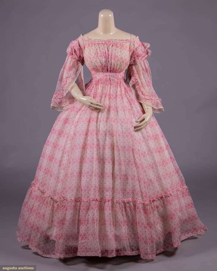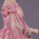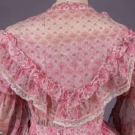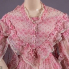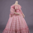 Printed cotton voile dress w/ diamond & miniature shaded tree pattern in alternating pink & white, broad scooped neckline edged w/ double piped band & drawstring, open pagoda sleeve w/ double dropped SH poof, sleeve edged w/ self-puff & applied self-ruffle, narrow lace trim to top of bodice & sleeves bodice w/ vertical gathers from neckline to W front & back, cartridge pleated attached skirt w/ broad hem flounce, matching pelerine, B 44.5", W 25.25", L 58", capelet L 13.5"-16", (repairs to both SHs, 2.25" repair CF B, 1" hole right underarm, trim detaching at cuffs) fair. Museum of the City of NY.