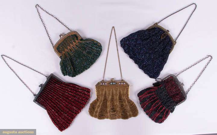 1 tan knitted w/ graduated amber beaded loops frame w/ cloisonné w/ pearl accents, Wd 7.5", L 6", (metal tarnished, lining shattered, detaching from frame); 1 w/ midnight iridescent blue beads, Wd 7.5", L 7", (bead loss & 1" of laddering CB at frame); 1 w/ graduated rows of red crystal beads on black silk knit, Wd 8", L 7", (bead loss, several small holes, lining shattered); 1 red silk knit w/ black facetted beaded bands & fringe, printed silk lining, Wd 6", L 7", (metal tarnished, beginnings of bead disease, 0.5" hole 1 side); 1 silk tan knit w/ peacock iridescent beads, Wd 7.5", L 6.5", (metal tarnished, 1" stain 1 side) all fair- good.