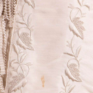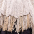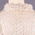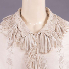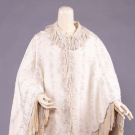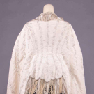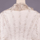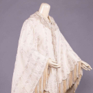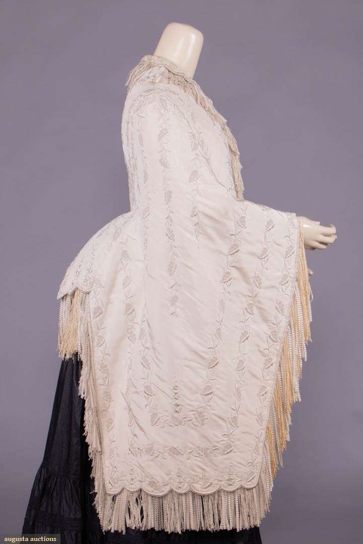 Dolman mantle of ivory silk ottoman w/ embroidered vines, Peking knots & crystal beaded accents, scalloped collar w/ fringed edging continuing down CF, twisted silk fringe w/ intermittent press pleated ribbons, China silk quilted lined, SH-SH 15", L 23.5"-38", (0.75" stain B, lining stained) excellent. Museum of the City of NY.
