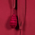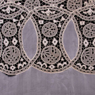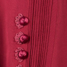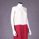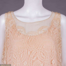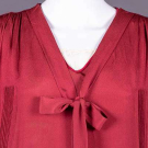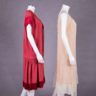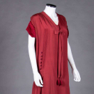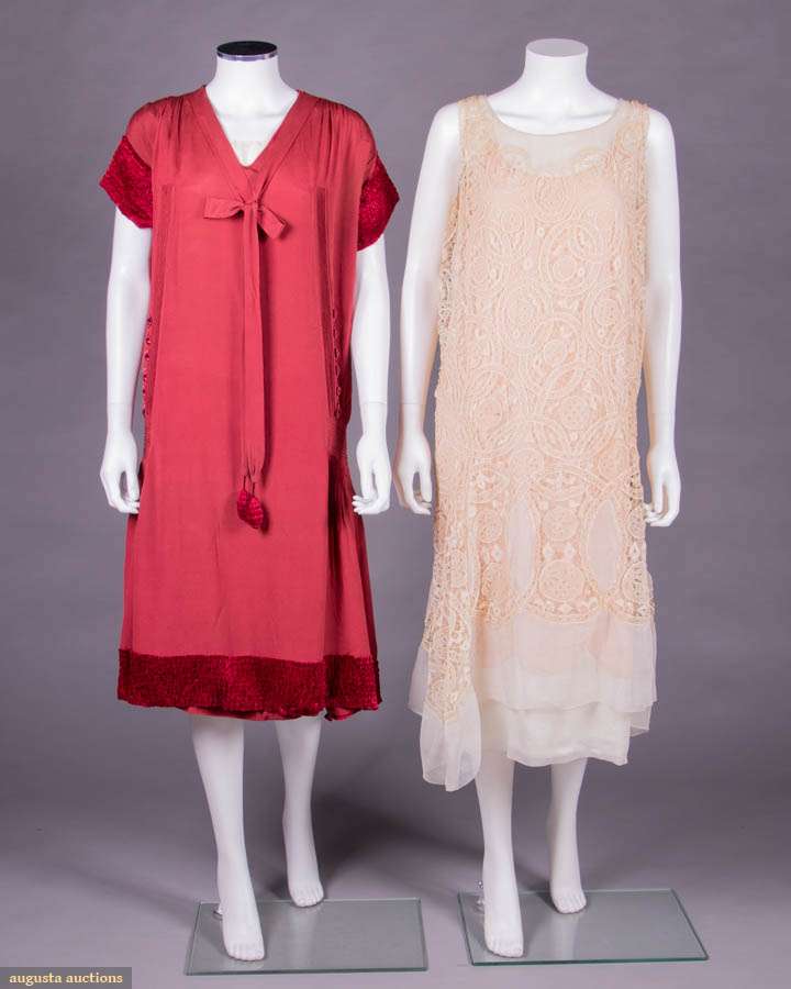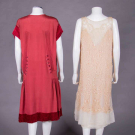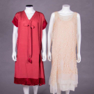 1 cranberry crepe day dress, velvet edged V-neck w/ cascading CF ties terminating in velvet pompoms, smocked SHs, either side of CF & CB, drop W & velvet broad cuffs & hem, 6 silk thread covered buttons w/ small festoon of applied silk cord to either side of both SSs, matching underdress w/ ivory silk gimp bodice & attached wrap skirt, B 50", H 42", L 42.5", (underarm & tiny-0.25"stains & stains to underdress) very good; 1 sleeveless ecru lace tea dress w/ chemical lace net into interlocking circles In highly abstract form, scoop neckline & asymmetrical hem of applied & inlaid ivory crepe chiffon, peach georgette underdress w/ double hem flounce of ivory crepe chiffon, B 41", L 48", (stain cluster lap, underarm stains) very good.