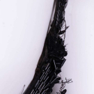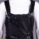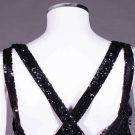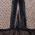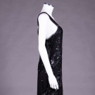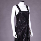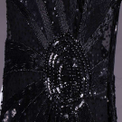 Black net heavily embellished w/ black bugle beads, jet rose cuts & black sequins in sunburst motif radiating from left H, beaded & sequined double SH straps diverging at top of SH, slightly flounced hem, synthetic underdress w/ attached silk satin broad hem band, B 35", W 34", L 58", (bead & sequin loss, wear, net fraying around straps & hem) very good. The Society for the Preservation of Federal Hill & Fell's Point.