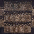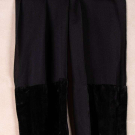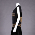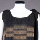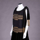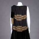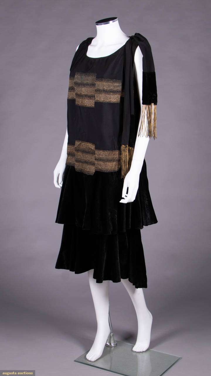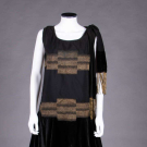 Black crepe silk bodice w/ geometric lamé bands woven into B & applied at W, self tie drape at left SH w/ silk velvet band at ends & bullion fringe, attached black silk velvet drop W band, original underdress w/ crepe bodice & black silk velvet for double flounced skirt, B 42", H 41", L 43.5"-46.5", (metal fringe & lamé oxidizing, light underarm stains, 0.5" stain CF B below collar, tiny spot stains) very good.