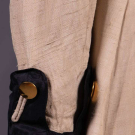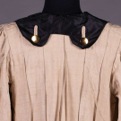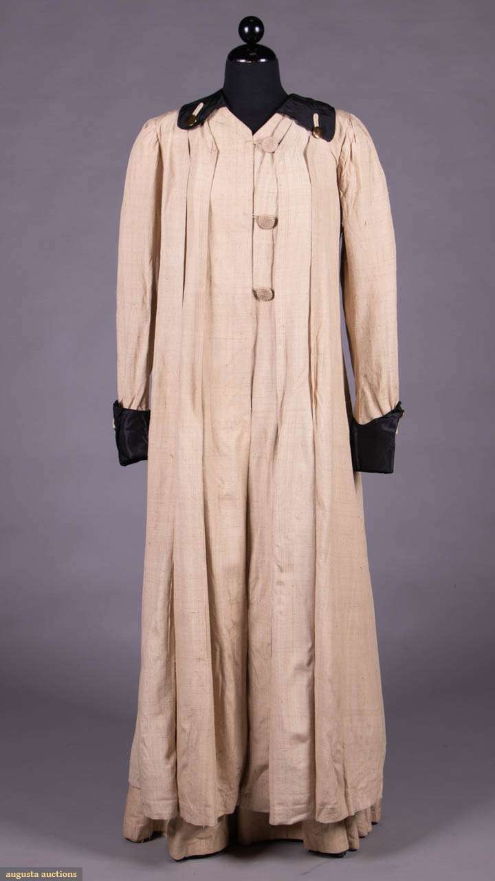Undyed silk pongee motoring ensemble c/o duster w/ geometric layered applied panels to front & let out pleated back, black silk collar & cuffs w/ corded faux button holes & flat brass shanked decorative buttons, 3 large crocheted toggle button CF closure, skirt w/ top stitched let out deep pleats for fullness, B 40", L 55", (pilling, buttons scratched, stains around hem esp. to CF), skirt W 24", L 41", (pilling esp. to lap, 1" stain cluster CF W, two 0.25" holes above hem) both good-very good. The Society for the Preservation of Federal Hill & Fell's Point.