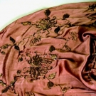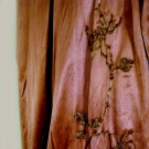 Light cinnamon silk satin decorated w/ chrysanthemums worked in couched gold thread, Sh-Sh 13", L 79", excellent.