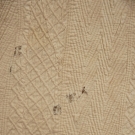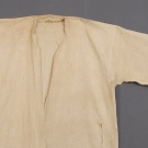 Cream cotton hand quilted w/ narrow cotton cord in alternating chevron & diamond vertical bands, small band collar, 2 pocket slits, cream silk lining, Ch 46", L 46", (small tears, scattered rust spots, 5 pea size holes lower right side, seam of one sleeve unstitched) good.