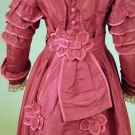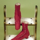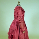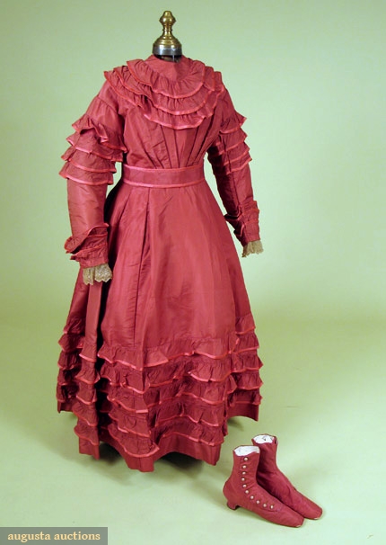 Deep dusty rose faille 1-piece day dress, self fabric flounce trim, separate belt w/ attached peplum, buckram lining, Ch 31", W 23.5", L 43", excellent, matching high button boots, low Louis heel & red speckled white china buttons, stamped on sole " H. Wireman Philada.", 2" x 8.25", heel 1.25", (shoes worn at edges) fair.