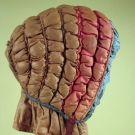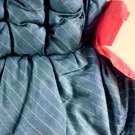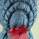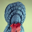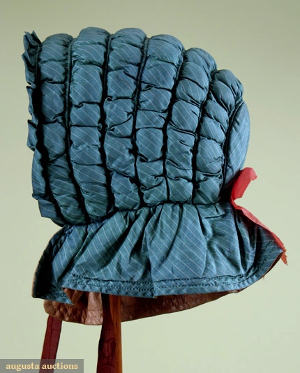 Teal blue w/ fine white diagonal pin-stripes, bonnet channel quilted & corded, 3.75" bavolet, fuschia silk lining & back bow, brown silk ties, Ht 9", Depth 9", (lining very faded) excellent.