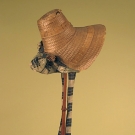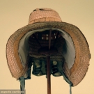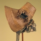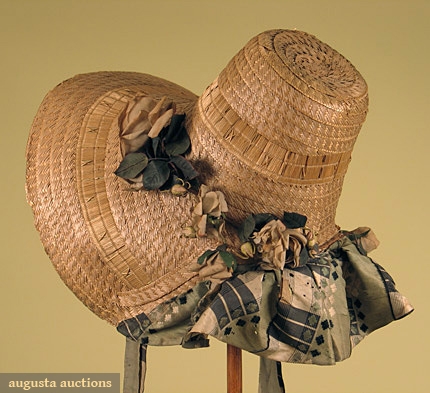 Natural straw w/ novelty weave & bands of straw openwork, wired brim, green, ivory & black plaid ribbon 4" bavolet & ties, cloth flower garland left side across bavolet, Crown Ht 5.5", Brim Wd 11", (taupe silk brim lining replaced, straw torn at brim edge and crown) fair.