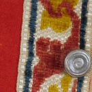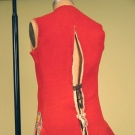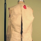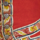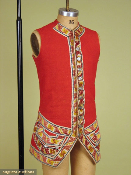 For livery, bright red tabby wool, lined in cream wool twill, sleeveless & long w/ brick red & yellow cut velvet ribbon, 2 pockets w/ flaps, 16 silver on wood shank buttons, 2 back ties, Ch 34", W 30", L 29", (1 missing button, lining moth damaged) good.