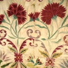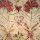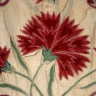 Pieced linen point de Beauvais (French chain stitch) wool embroidery in design of scrolling foliage and carnations worked in shades of red, green & gold, 16.5" X 27", (holes, tears, soiling) fair.