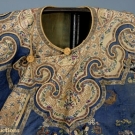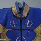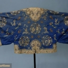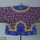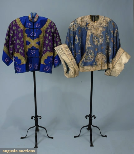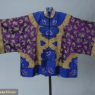 1 purple w/ silver metallic brocade collar, placket & cuffs, embroidered w/ butterflies, (minor fading) good; 1 winter lined robe of purple silk damask w/ collar, cuffs & placket embroidered w/ butterflies, excellent.