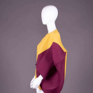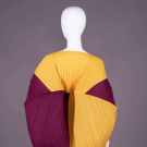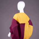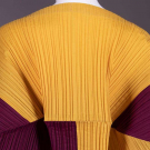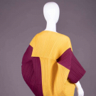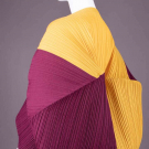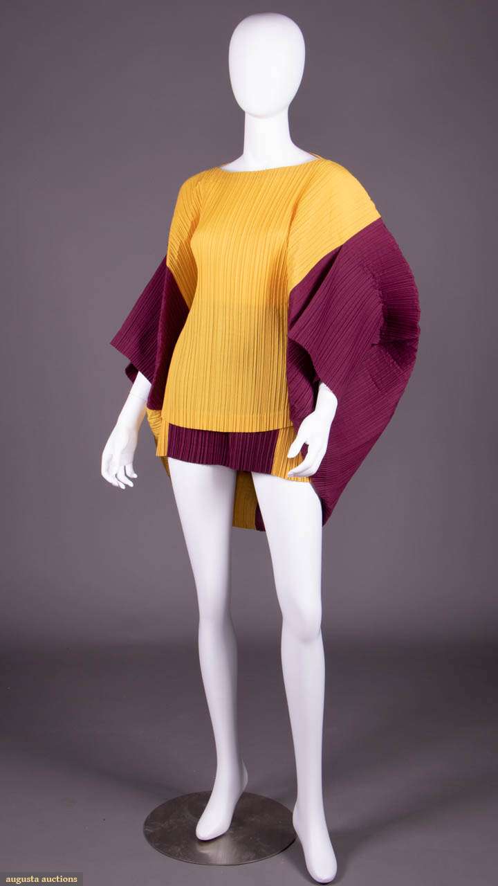 Both in canary yellow & wine red pleated polyester, neck slit & attched straight glove length sleeves, dress B up to 54", L 25.5"-32", matching color block shorts w/ 2 patch pockets at seat, W 22"-36", L 15", inseam 2.25", (both w/ light wear) both excellent. Similar piece exhibited in "MIYAKE ISSEY EXHIBITION", at the National Art Center, Tokyo, 2016, exhibit # 16 & featured in exhibition catalog & Metropolitan Museum exhibit "MANUS x MACHINA Fashion in the Age of Technology", May 5-September 5, 2016.