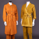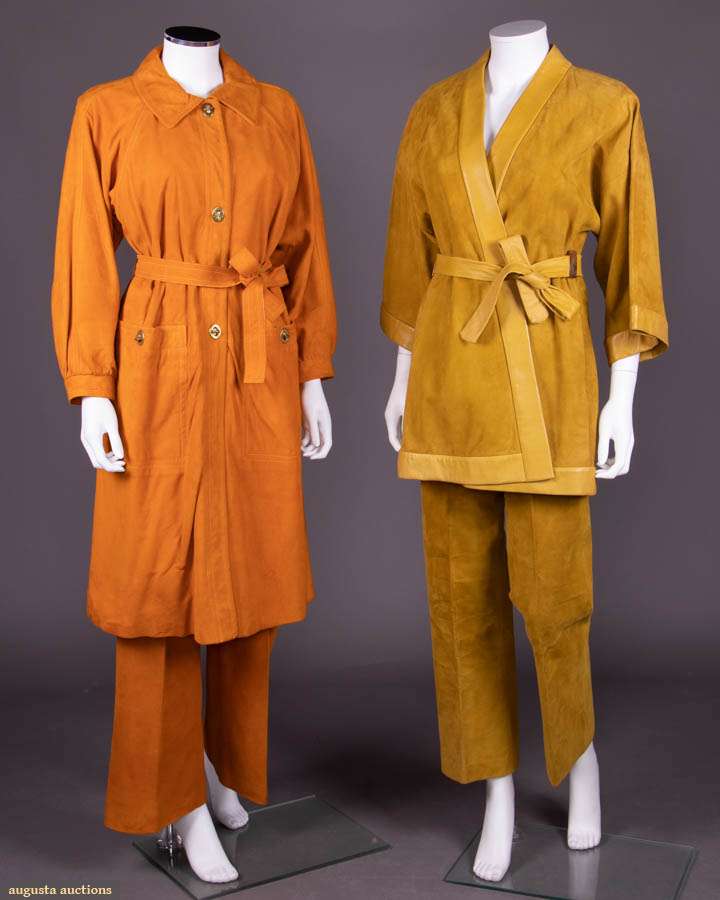 Both w/ label "Sills, A Bonnie Cashin Design": 1 turmeric suede ensemble c/o self-belted trench coat & matching trousers w/ brass toggle closures at CF, pockets & at W closures on pants, 1969-1972, coat B 45", W 42", L 43", pant W 29.5", L 41", inseam 29", (metal tarnished, light wear at seat, lap & W band, tiny-0.5" spot stains); 1 mustard brown sueded leather ensemble c/o kimono style jacket w/ leather edging at collar, CF, cuffs, W & belt, brass toggle closure at W band of trousers, 1968-1972, B 48", L 32.5", pant W 27.25", inseam 29.5", (pinholes in lapel, light wear, tiny spot stains, metal tarnished) both good; t/w blue cotton poplin coat w/ tattersall check lining, label "Bonnie Cashin Weatherwear for Russ Taylor", 1974-1980, B 43", L 41.5".