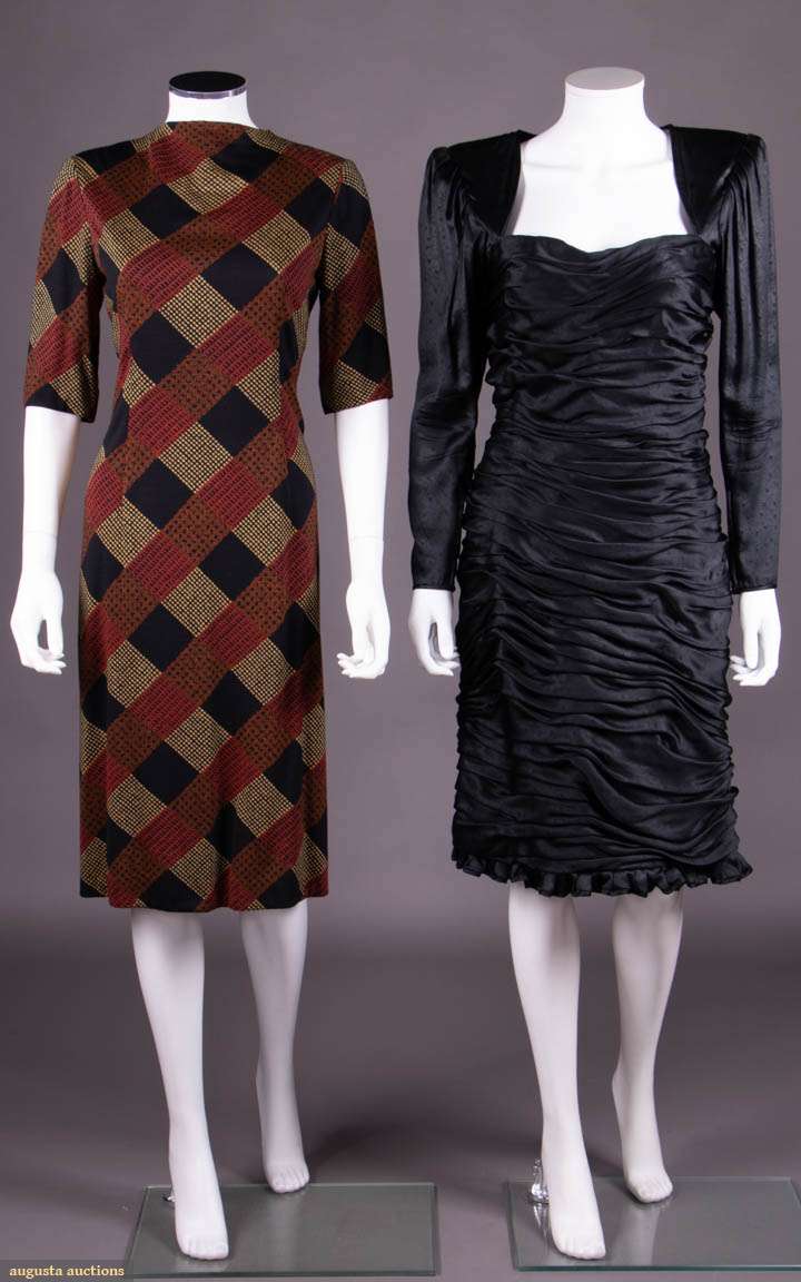 1 jersey day dress printed w/ diagonal wide ribbon stripe plaid w/ elbow length sleeves, CB W tie & zip closure, 1960s, label "Pauline Trigère", B 41", W 26"-34", L 42.5", (paint at zip chipping) excellent; 1 black silk in woven imitation ostrich leather pattern w/ sweetheart neckline, controlled draped pleating to body & narrow knife pleated hem ruffle, extended horizontal SHs knife pleated to armscye, zip at cuffs & CB, 1980s, label "Ungaro Parallele Paris", B 35.5", W 30", L 41", (tiny spot stains & 0.25" worn spot at zip) very good. Ohio State University Historic Costume & Textiles Collection.