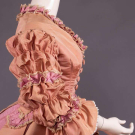 4 pc Montserrat orange ribbed silk w/ CF self covered button closures, paired ruching at sleeves separated by box pleated & lace edge pink silk taffeta bias band trim also to V-neckline & to stylized polonaise overskirt, detachable W band fastening at CF self-loop w/ 3 decorative silk & lace edged festoons over pink taffeta faux peplum, full trained underskirt lined in glazed cotton & buckram, B 34.5", W 22", L 15", overskirt W 22.5", L 36"-46", underskirt W 22", L 42"-65", belt W 20"-26", L 33", (left collar ruffle detaching, 3" stain left B w/ tiny areas of wear, underarm stains, light wear, overskirt W band unpicked, tide marks skirt & belt, underskirt hemline shattering, discoloration/light wear/spot stains to skirt) good. Museum of the City of NY