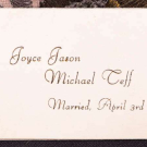 Heavy floral silver & gold lamé embroidery on panné velvet w/ double hinged gilt frame, moiré silk lining, w/ seating card for the wedding of Joyce Jason & Michael Celf, Mr. Leonel Shine, April 3rd 1955, probably French, 7.75" x 6.25", (frame warped, embroidery tarnished, small pulls, wear to velvet, red marks in lining, discoloration to edges) good.