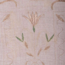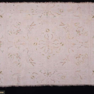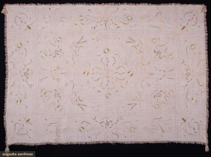 Quilted cotton coverlet w/ silk & linen embroidery in stylized avian & floral motifs, corner tassels & woven cotton looped fringe, 60" x 90", (smelly, wear to embroidery & embroidery loss, messy fringe, light wear, tiny-1" spot stains, bleached) fair.